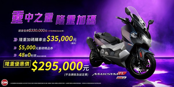 活動說明:MAXSYM TL508優惠價295,000元(已扣購車金/不含牌險及分期設定費)=建議售價$330,000(不含牌險及設定費等費用)-三陽購車補助金35,000元(直扣)。