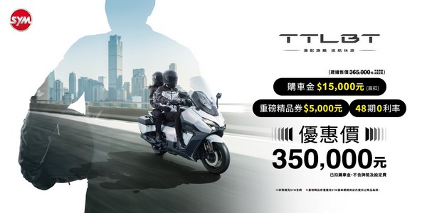 活動說明: TTLBT優惠價350,000元(已扣購車金/不含牌險及分期設定費)=建議售價$365,000(不含牌險及設定費等費用)-三陽購車補助金15,000元(直扣)。