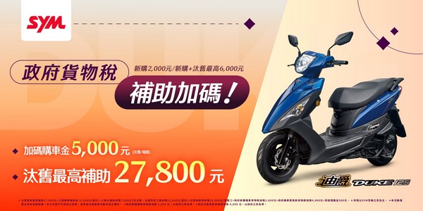 政府新購機車貨物稅減徵新政策,SYM三陽機車補助機種說明如下。