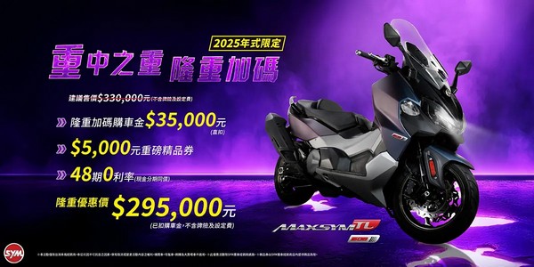 活動說明:2025年式MAXSYM TL508優惠價295,000元(已扣購車金/不含牌險及分期設定費)=建議售價$330,000(不含牌險及設定費等費用)-三陽購車補助金35,000元(直扣)。