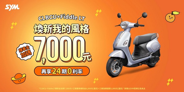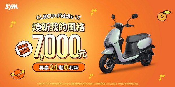 活動說明:Fiddle LT購車金優惠7,000元=三陽購車補助金6,000元(直扣)+三陽加碼優惠1,000元(直扣)。