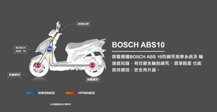 搭載德國BOSCH ABS 10防鎖死剎車系統及 輪速感知器,有效避免輪胎鎖死,濕滑路面 也能保持操控,安全再升級。