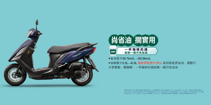 ◆油箱變大5.5L→6.5L 續航里程提升20% 高效節能更省油,通勤代步更輕鬆,順順騎,一杯咖啡的錢能騎一個月免加油