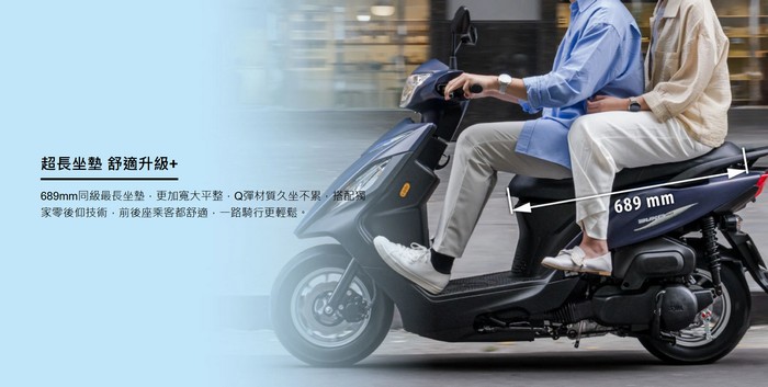 689mm同級最長坐墊,更加寬大平整,Q彈材質久坐不累,搭配獨家零後仰技術,前後座乘客都舒適,一路騎行更輕鬆。
