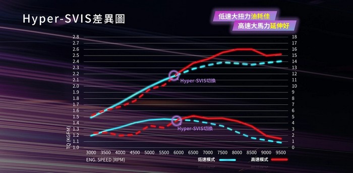 低速進氣管接合於進氣道口,低轉速時達到良好的進氣慣性,增加低速扭力反應,中低速馬力提升6%。
