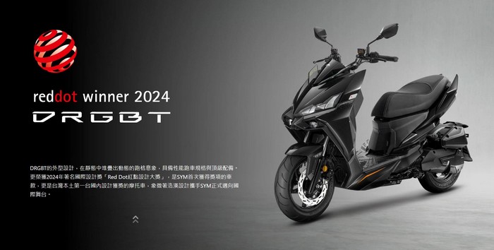 DRGBT的外型設計,在靜態中堆疊出動態的跑格意象,具備性能跑車規格與頂級配備。更榮獲2024年著名國際設計獎「Red Dot紅點設計大獎」,是SYM首次獲得獎項的車款,更是台灣本土第一台國內設計獲獎的摩托車,象徵著浩漢設計攜手SYM正式邁向國際舞台。